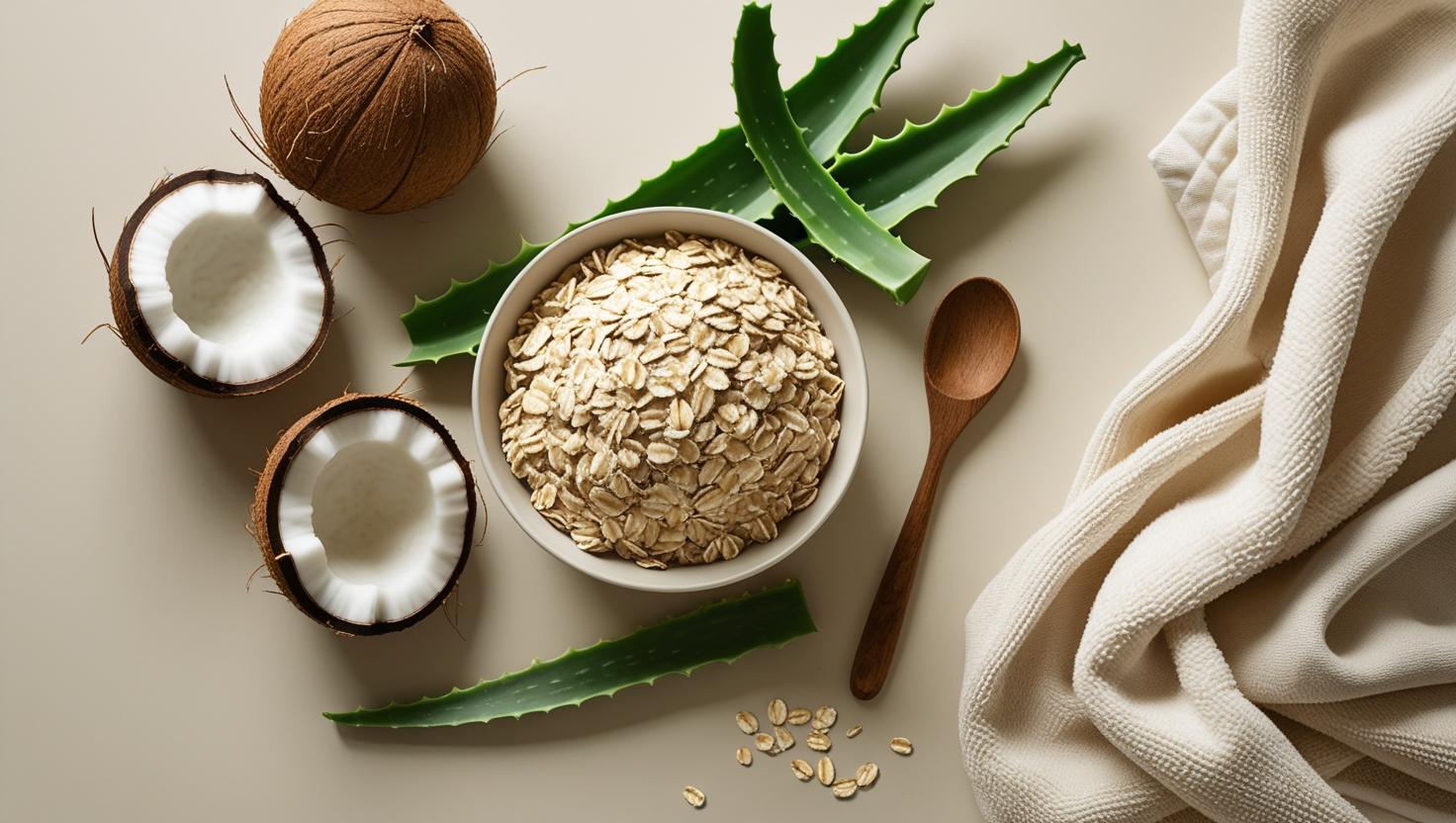 “Natural skincare ingredients flat lay – coconut, oats, and aloe vera on white”